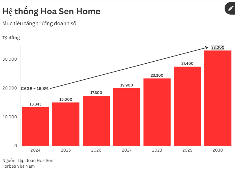 Công ty đặt mục tiêu tăng trưởng kép bình quân hàng năm là 16.3%. Năm 2025, Tập đoàn Hoa Sen dự kiến rót 1.060 tỷ đồng để phát triển hệ thống Hoa Sen Home. Trong đó, 400 tỷ đồng sẽ được dành cho việc mở rộng hệ thống cửa hàng, 500 tỷ đồng đầu tư vào hệ thống kho, 60 tỷ đồng cho công nghệ và 100 tỷ đồng cho hoạt động marketing.